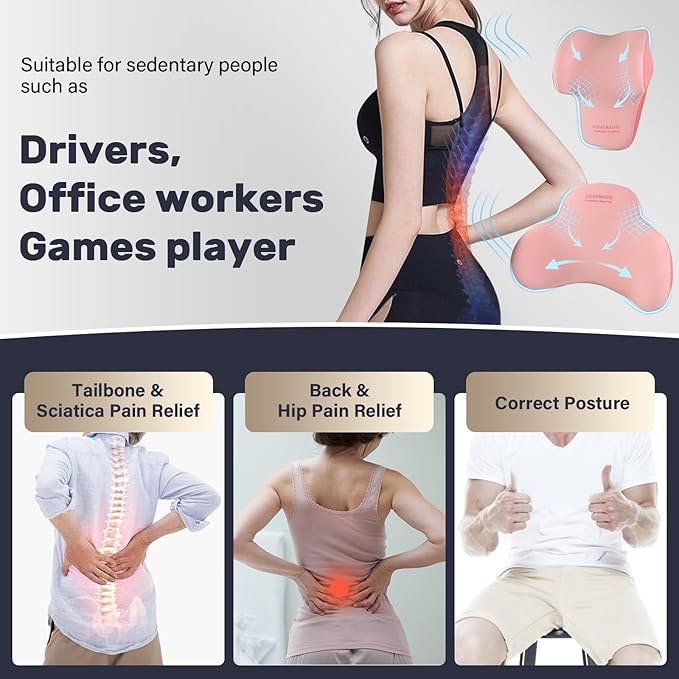 Coverado Lumbar Support and Car Neck Pillow, Ergonomic Memory Foam Desk Chair Cushion and Headrest Pillow for Car Office Chair, Sciatica & Neck & Tailbone Cushion-Pink