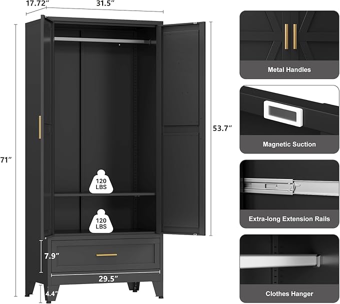 - Easy Assembly:With simple step-by-step instructions and labeled parts, this metal armoire unit is a breeze to assemble. Wipe clean with a dry cloth for maintenance. If you have any questions about our wardrobe or their operation procedures, please contact us
