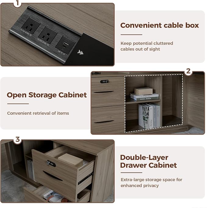 - Secure Storage Solution with Lockable Drawers This executive office desk offers secure storage with integrated lockable drawers, perfect for keeping confidential files, electronics, and personal items protected. The combination of enclosed compartments and open shelving supports an organized workstation, ideal for both home office setups and professional business environments.