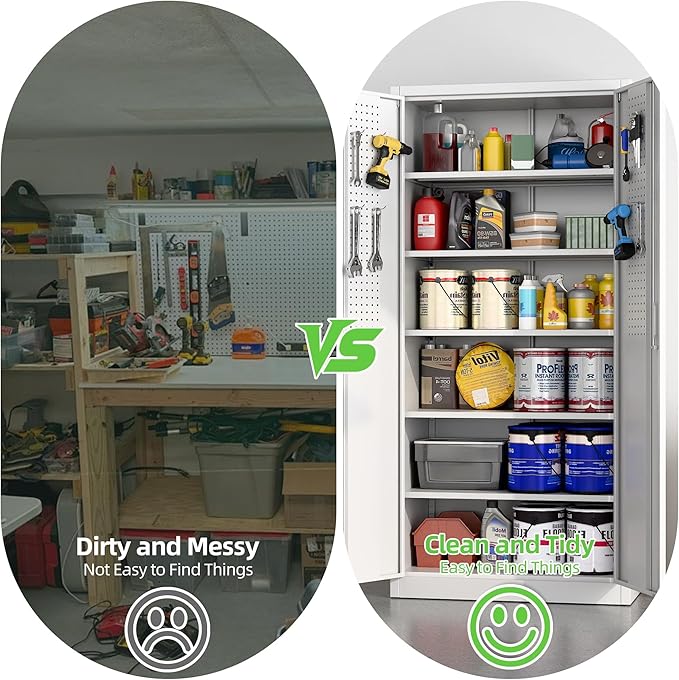 - [Adjustable Shelves&Large Weight Capacity] Garage storage cabinet has 5 adjustable and removable shelves, which can offer you flexible space. Each shelf of the storage cabinet can hold up to 120lbs.