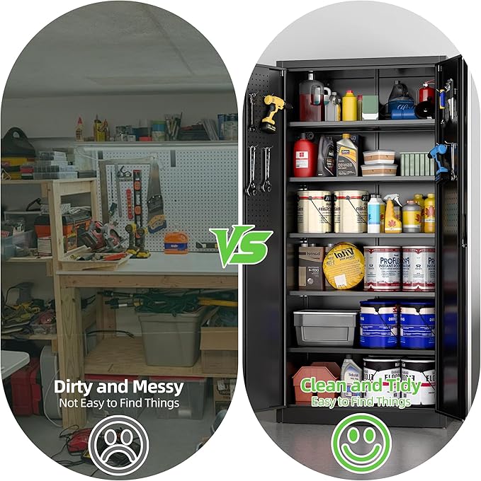 - [Adjustable Shelves&Large Weight Capacity] Garage storage cabinet has 5 adjustable and removable shelves, which can offer you flexible space. Each shelf of the storage cabinet can hold up to 120lbs.