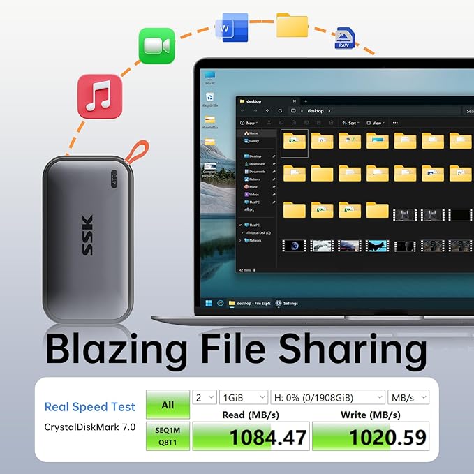 - Blazing Transfer Speeds: 4TB SSD external hard drive reads up to 1050MB/s and writes up to 1000MB/s via USB 3.2 Gen2. Transfer massive files in seconds—ideal hard drive for video editors, gamers, and photographers needing fast access