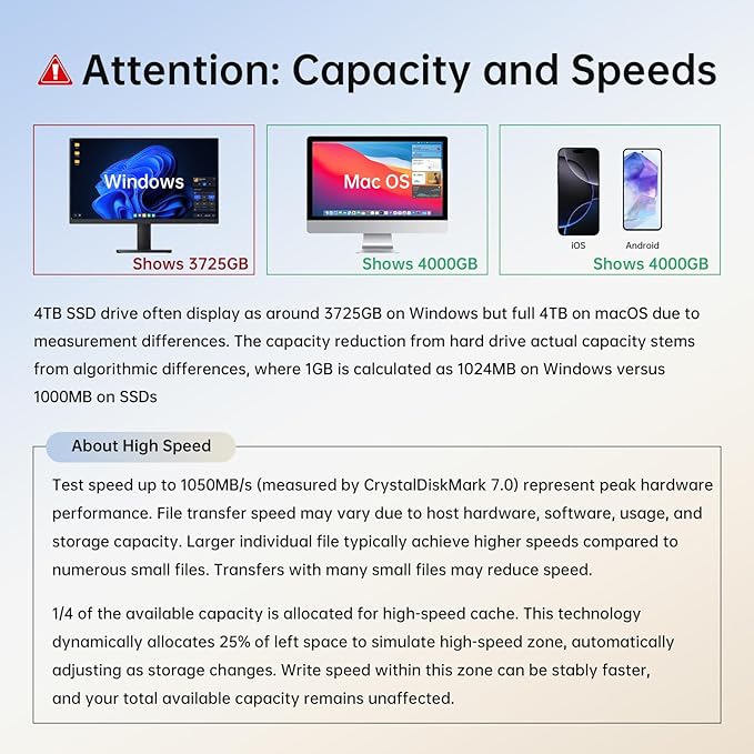 - Full 4TB Massive Storage: 4tb external hard drive may display as 3725GB on Windows but 4TB on macOS due to measurement differences. The capacity reduction from hard drive actual capacity stems from algorithmic differences, where 1GB is calculated as 1,024MB on Windows versus 1,000MB on SSDs