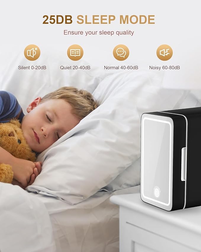 - Ultra-low Decibels in Operation: The new noise reduction technology makes the skincare fridge reduce to 25 dB less disruptive to work and everyday life, It ensures that your environment keep quiet whether in the bedroom, office, or baby's room.