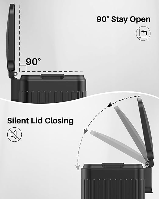 - Whisper-quiet Closing & 90° Stay Open Lid: The recycle bins for kitchen feature a soft-close mechanism that allows the lid to close gently, slowly, and silently. Just flip up the lid slightly, the trash can with lid will lock into a 90° open position as you want