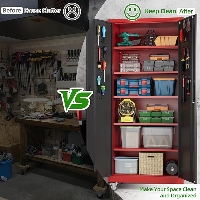 Aobabo Upgraded Garage Storage Cabinets with Wheels,Metal Storage Cabinets with 5 Adjustable Shelves for Garage Home Office Storage, Red-Black,71''H*32''W*16''D,Assembly Required