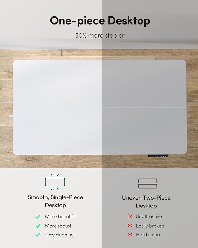 - Seamless One-Piece Design: Fezibo adjustable standing desk features a smooth, one-piece desk surface without visible seams. Unlike other models with joined panels, this seamless design offers 30% enhanced stability to provide a solid foundation for your equipment.