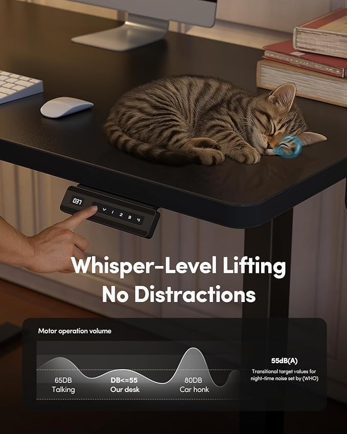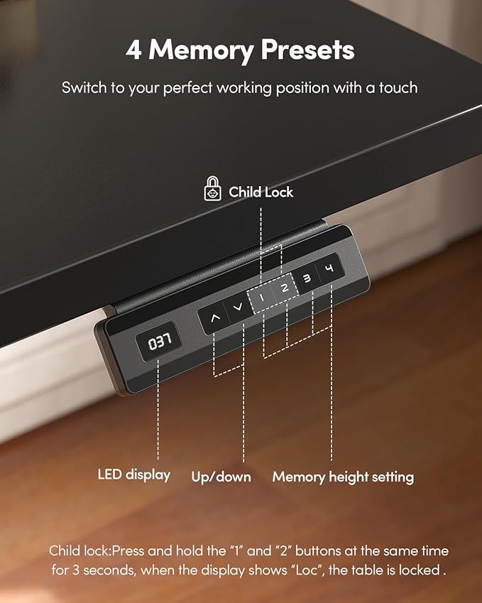 - 4 Memory Height Presets: The Fezibo Electric Standing desk features an intuitive LED controller for quiet operation. It allows you to save up to 4 custom height settings to seamlessly switch between your preferred heights, ensuring you have a focused, distraction-free workspace.