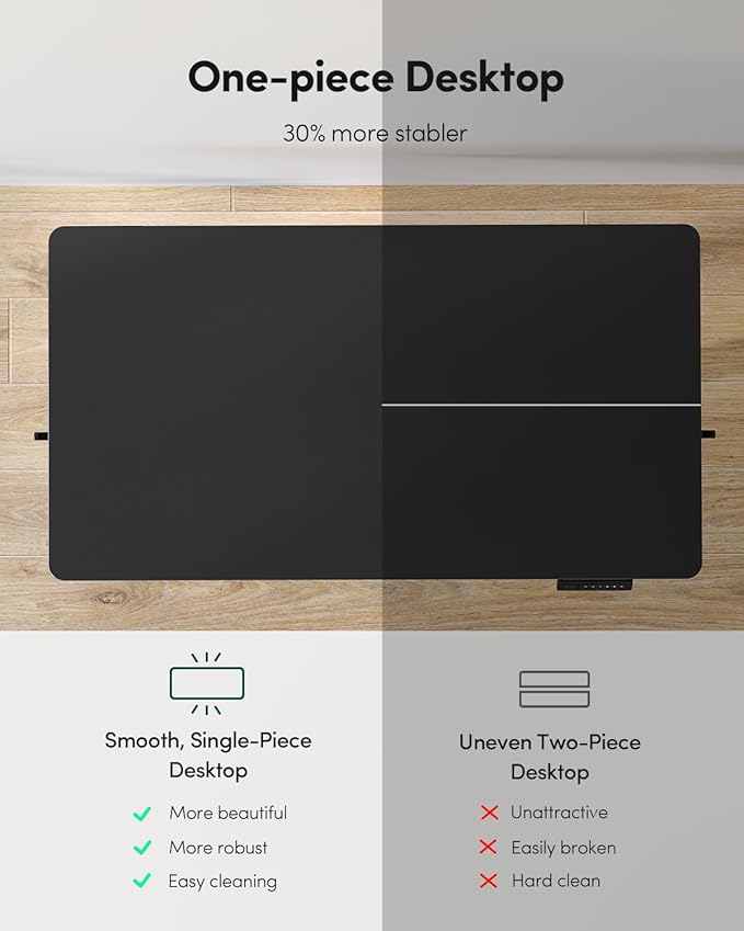 - Seamless One-Piece Design: Fezibo adjustable standing desk features a smooth, one-piece desk surface without visible seams. Unlike other models with joined panels, this seamless design offers 30% enhanced stability to provide a solid foundation for your equipment.
