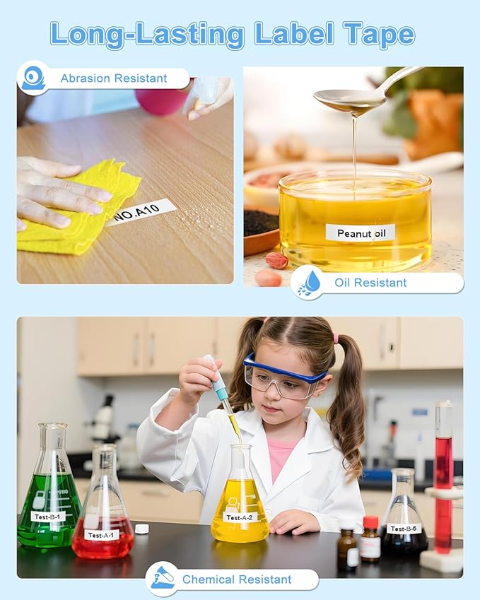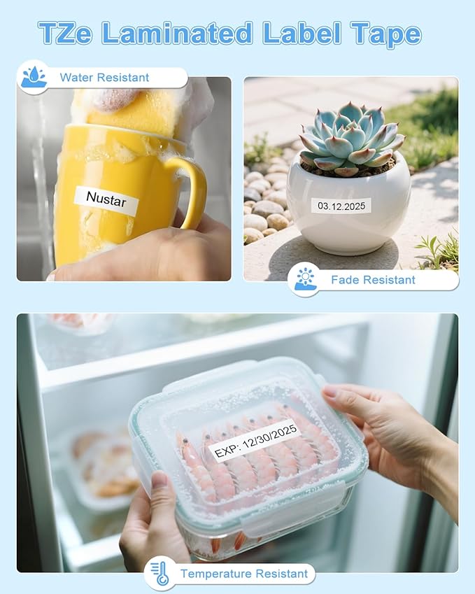 - (3)Abrasion resistant, This Compatible with label maker refill tape have strictly tested before sale; (4) Chemical resistant, label maker tapes can be immersed such as water, machine oil, etc; (5) Temperature resistant, our ptouch label tapes can be stored in both cold and hot environment