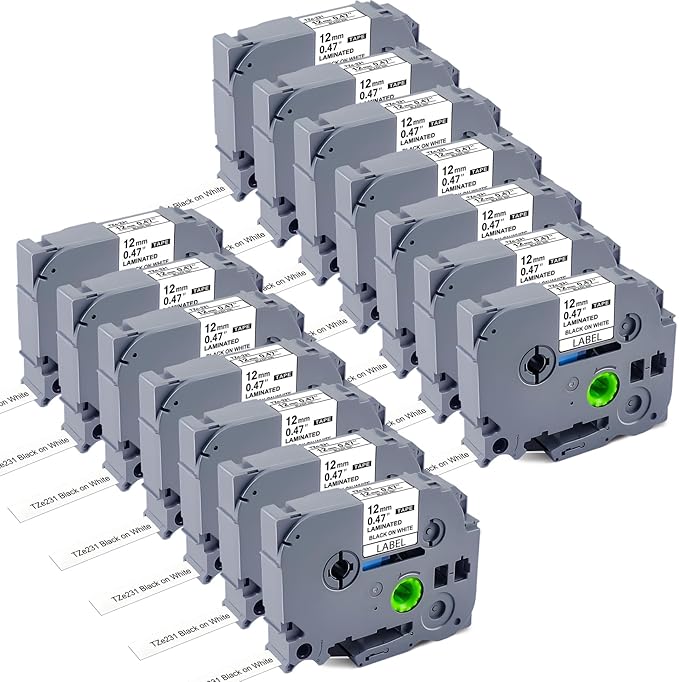 - 14Pack Replacement for Brother P Touch Label Tape TZe-231 TZe231 TZ-231 TZ231 TZc-231; Each Compatible with Brother Label Tape Measures Width: 0.47 Inch (12mm), Length: 26.2 Feet (8m); Color: Black on White Label Maker Refills