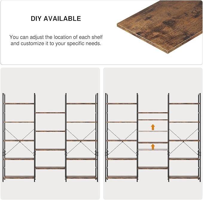 OTK Triple Wide 5 Tier Bookshelf, Rustic Industrial Style Bookcases with 14 Open Display Shelves, Wide Bookshelves for Bedroom, Living Room and Home Office, Rustic Brown